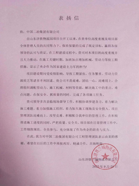 9月29日,山東濟鐵蘭城物流有限公司向中國二冶致表揚信,表揚中國二冶團結一心、迎難而上,在施工關鍵節(jié)點,加班加點搶工期,克服重重困難,保質保量完成既定目標,充分展示出央企作為國家建設主力軍的擔當作為。