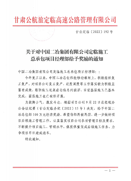 10月18日,甘肅公航旅定臨高速公路管理有限公司發(fā)布通報(bào),對中國二冶定臨項(xiàng)目部能夠迎難而上,積極組織復(fù)工復(fù)產(chǎn)等工作進(jìn)行表揚(yáng),并給予100萬元經(jīng)濟(jì)獎(jiǎng)勵(lì)。
