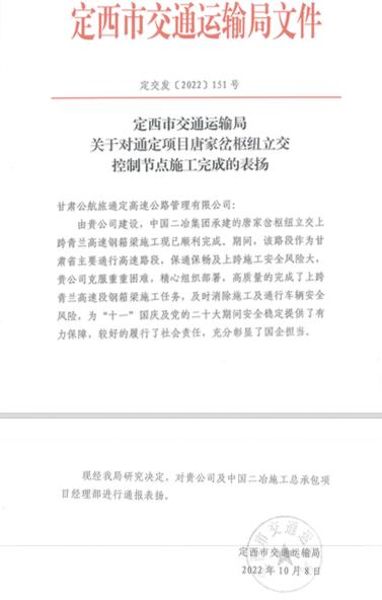 10月21日,中國二冶通定高速項(xiàng)目部收到來自定西市交通運(yùn)輸局的表揚(yáng)信,對中國二冶通定高速項(xiàng)目部管理團(tuán)隊(duì)按時(shí)完成節(jié)點(diǎn)目標(biāo)表示高度肯定。