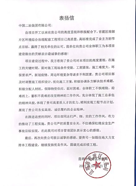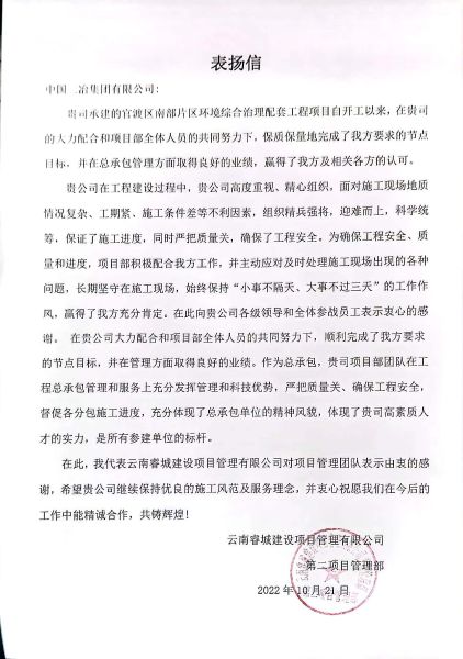 10月22日,中國(guó)二冶官渡項(xiàng)目部連續(xù)收到兩封來(lái)自業(yè)主單位昆明市官渡區(qū)水務(wù)局和云南睿城建設(shè)項(xiàng)目有限公司的表?yè)P(yáng)信,對(duì)中國(guó)二冶路橋分公司官渡項(xiàng)目部在官渡區(qū)南部片區(qū)環(huán)境綜合治理配套工程項(xiàng)目建設(shè)過(guò)程中,直面多種困難,精心策劃、科學(xué)管理、全力以赴的工作態(tài)度表示贊賞。